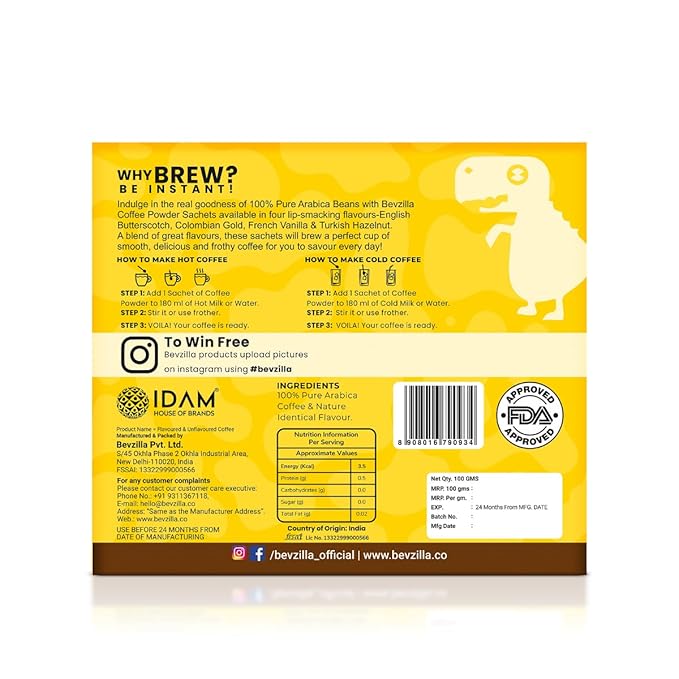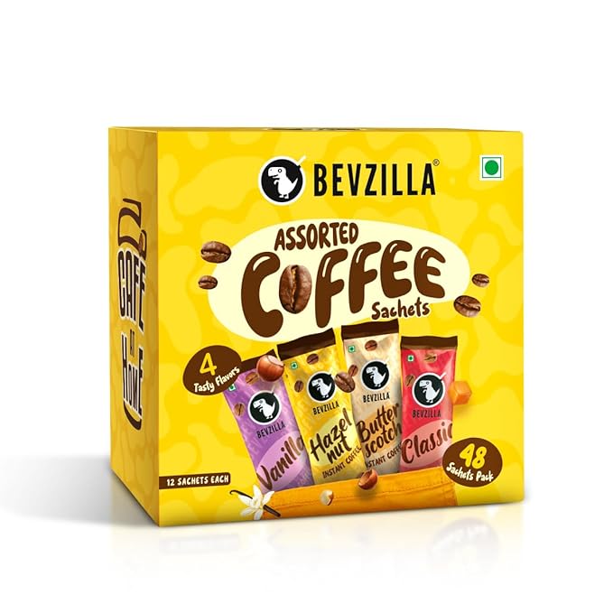 Bevzilla 48 Instant Coffee Powder Sachets (4 Flavours) - 96 Grams | Hazelnut, Classic, Vanilla & Butterscotch | 12 pouches Each Flavour | Arabica Coffee | Perfact for Espresso, Latte, Cappuccino | Hot & Cold Coffee,