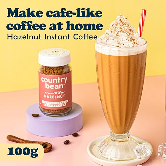 Country Bean Hazelnut Instant Coffee Powder Jar, 100 gram | Arabica, Freeze-Dried, Flavoured Coffee | No Added Sugar | Makes 50 Cups,