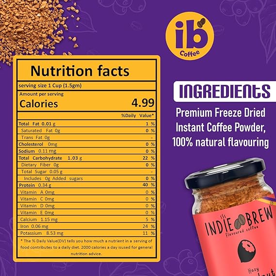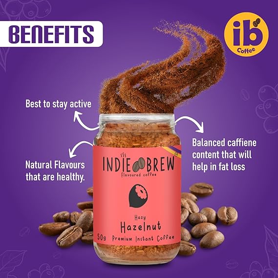 Indie Brew Hazelnut coffee, Arabica, Freeze dried flavoured coffee, No Added Sugar, Low Calorie, Instant powder for staying active | 50g | Makes 25 bold cups | Strong Aroma,